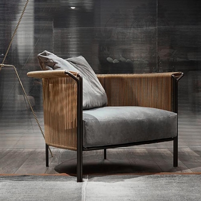 Modern Woven Rattan Outdoor Barrel Chair Armchair with Back Flared Edge in Brown & Gray