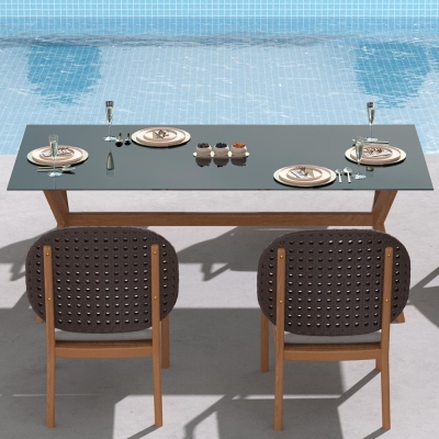 3 Pieces Teak Wood Outdoor Dining Set with Glass Top Table Rattan Armchair in Natural