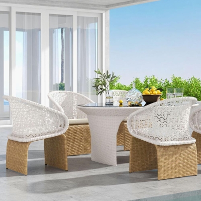 7 Pieces Traditional Aluminum Outdoor Dining Set with Oval Glass Table Rattan Armchair